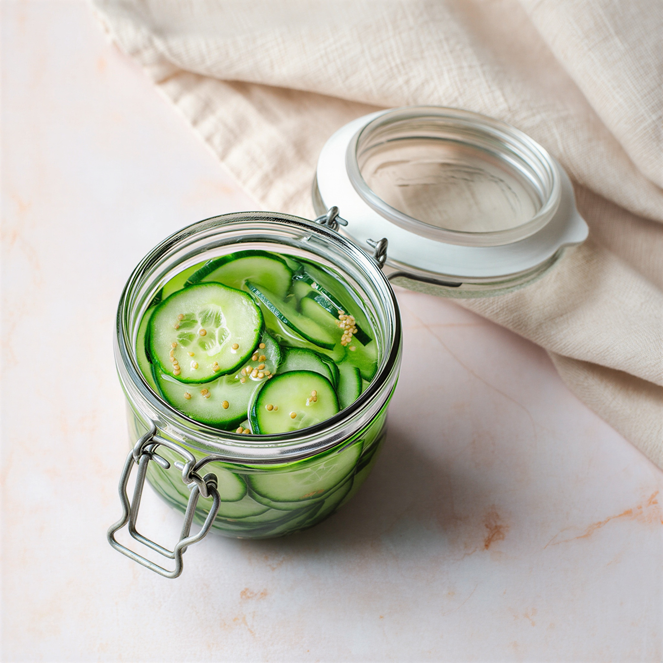 - Переложите нарезанный огурец в банку объёмом около 600-700 мл. Добавьте семена горчицы, если используете.