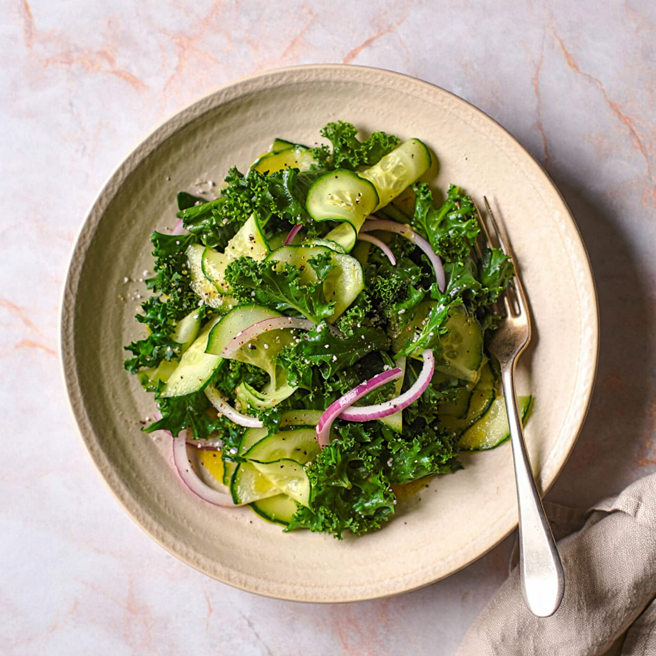 - Огурец нарежьте тонкими полукружьями или четвертинками и добавьте к кейлу. Сразу же добавьте тонко нарезанный красный лук.